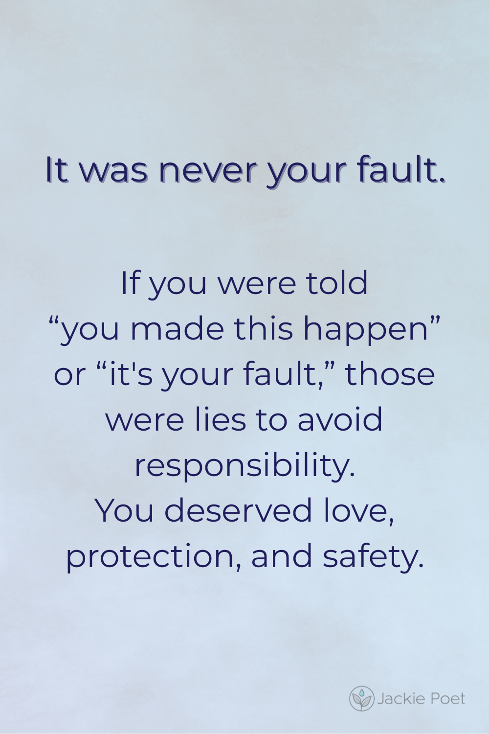 If you were ever told “you made this happen,” “you made me do this,” or “it’s your fault,” you need to know these were lies designed to protect your abuser from taking responsibility for their actions.